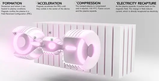 Реактор-прототип Helion требует четырех отдельных стадий для синтеза, который в конечном итоге приводит к производству электроэнергии за счет индуцированных изменений тока. ГЕЛИОН ЭНЕРДЖИ