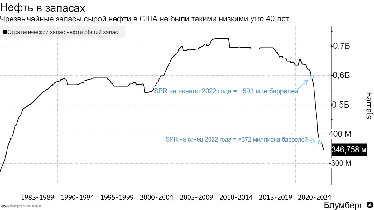 Стратегический нефтяной резерв, известный как SPR, в настоящее время составляет 346,8 млн. баррелей, что является самым низким показателем с 1983 года и соответствует примерно 18-дневному запасу. Общая доступная ёмкость хранилищ составляет 714 млн. баррелей.