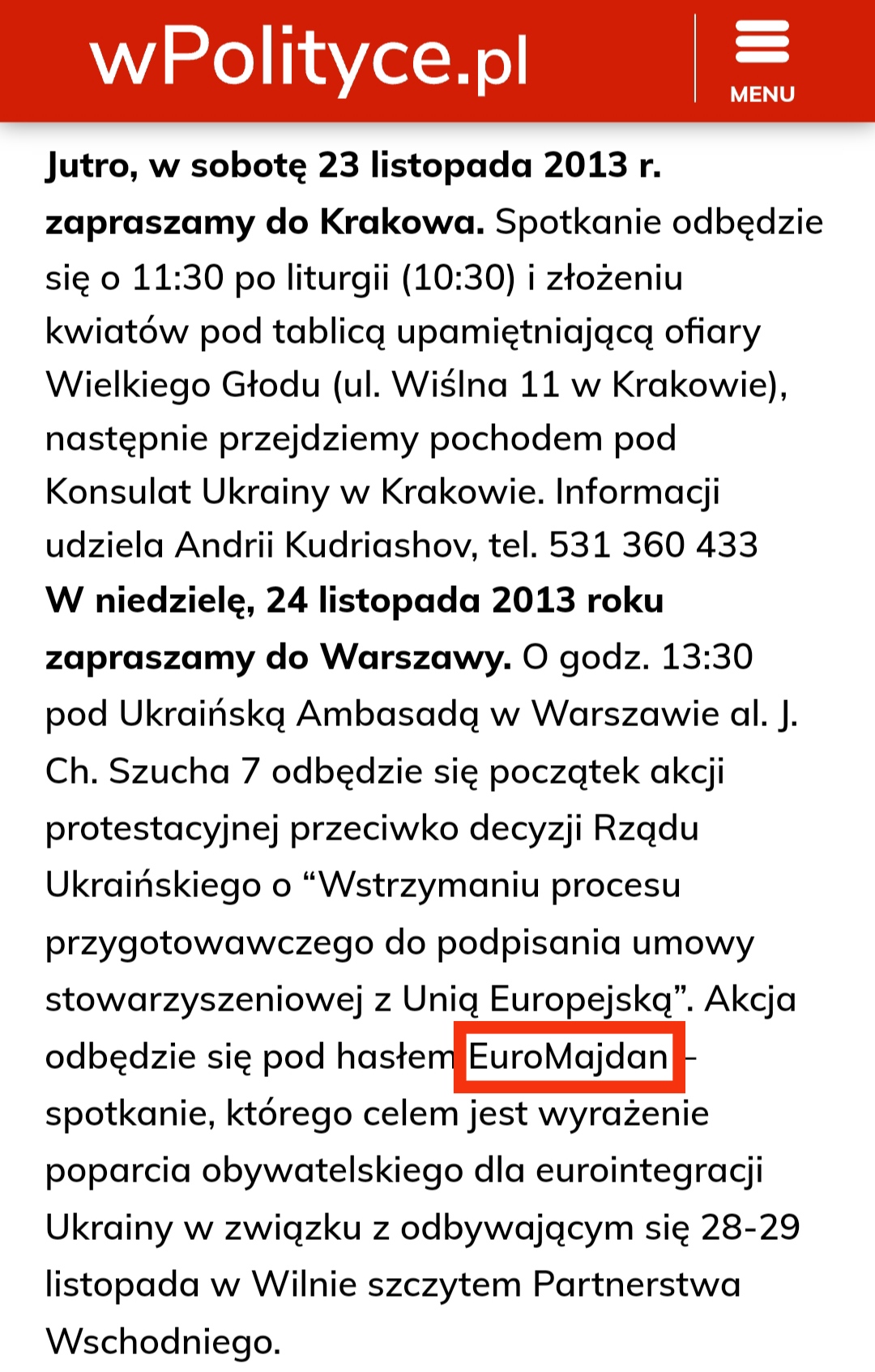Первая страница архива на портале "WPolityce" с упоминанием "протестов в Киеве" (выборка по слову "Majdan"), 22 ноября 2013