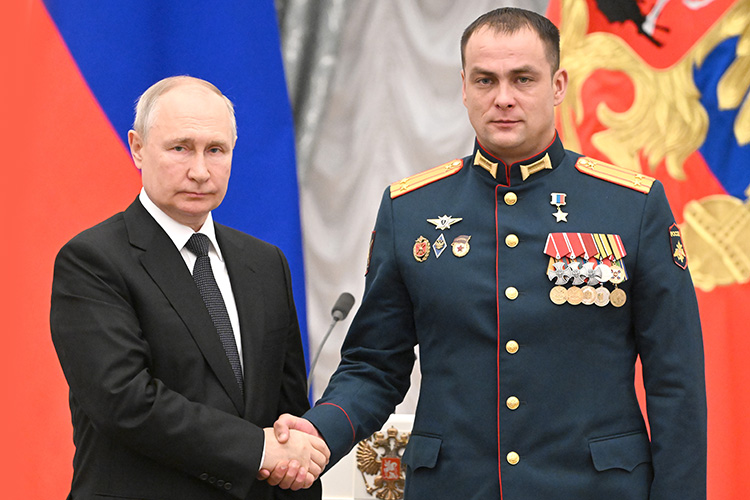 35-летний подполковник Ирек Магасумов, удостоенный трёх Орденов Мужества, получил из рук Президента Российской Федерации Владимира Путина Звезду Героя России/Фото: Алексей Майшев/POOL/ТАСС