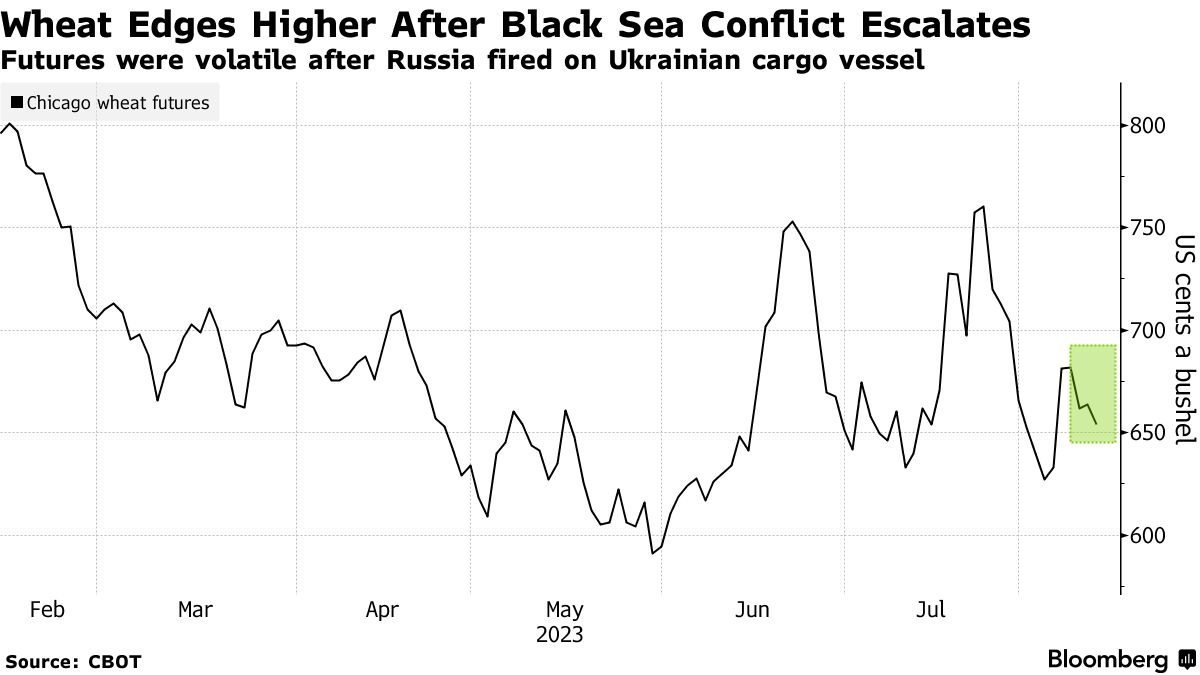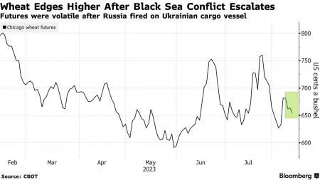 Поставки зерна в Причерноморье оказались под угрозой после истечения срока действия в июле соглашения, разрешавшего безопасный проход судов, экспортирующих украинское зерно и другие продукты питания из портов вблизи Одессы. Обеспокоенность также сохраняется после того, как около недели назад украинский беспилотник атаковал нефтяной танкер под российским флагом. Пшеница по-прежнему остается примерно на 17% дешевле в этом году на фоне небывалых урожаев.