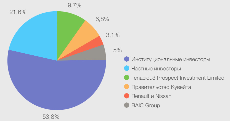 Структура капитала Даймлера на схеме представлена в виде пирога. Загадочная, на первый взгляд, фирма Tenaciou3 контролирует 9,69% акций, которые купил босс Geely Ли Шуфу. Компании Renault и Nissan владеют равными долями в 1,54%.