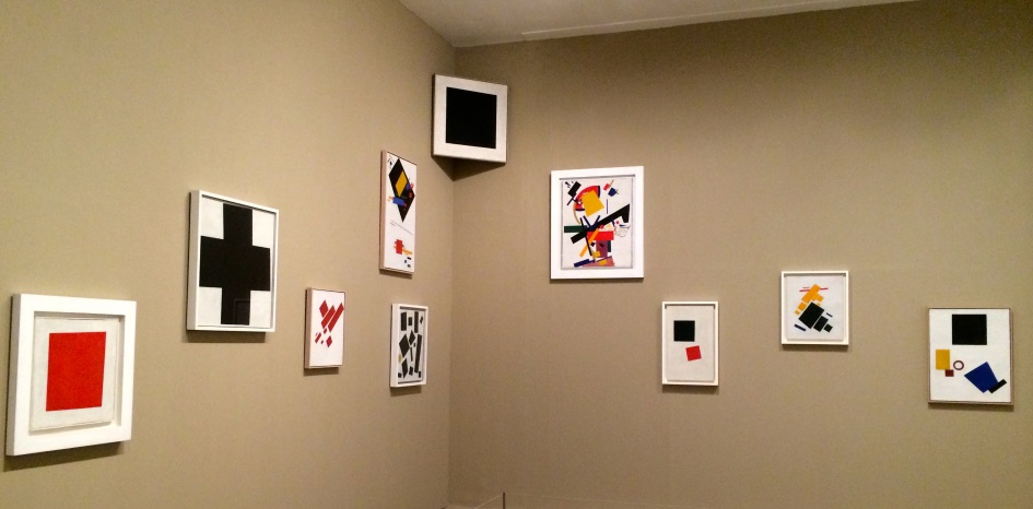 “Черный квадрат”, который показывает абсолютно черный квадрат на белом фоне. Его дебют в 1915 году был спорным, не в последнюю очередь потому, что он был выставлен высоко в углу галереи, место в русских домах традиционно зарезервировано для религиозных икон. Повешенный в том же положении на выставке Stedelijk https://www.economist.com/books-and-arts/2013/10/26/supreme