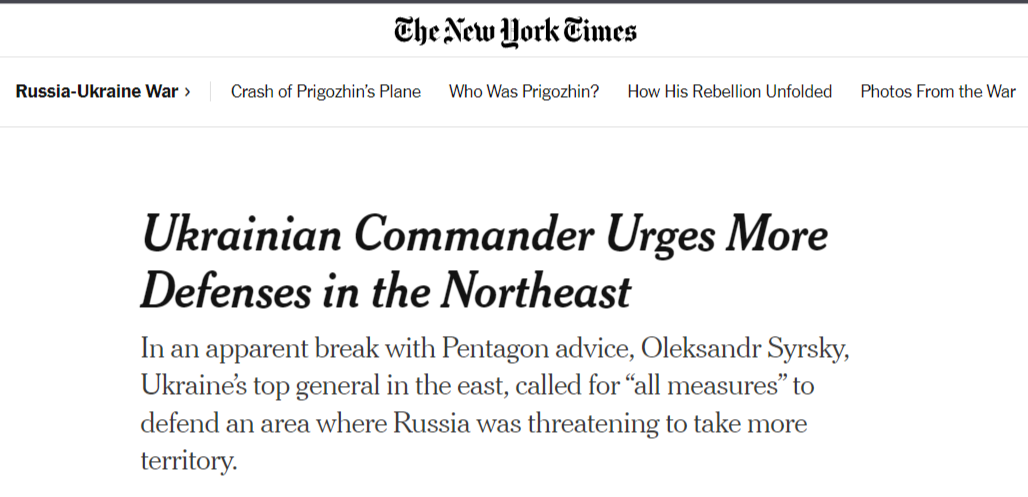 Дебаты по поводу стратегии Украины в последние дни попали в поле зрения общественности на фоне шквала сообщений средств массовой информации, в том числе New York Times, в которых официальные лица США возлагают вину за медленный прогресс Украины в значительной степени на ее стратегию.
