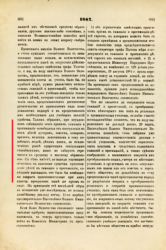 Так же как и вы, совкодрочеры, перевираете якобы закон о "кухаркиных детях", который назывался Циркуляр «О сокращении гимназического образования», прозванный «циркуляром о кухаркиных детях», - нормативный акт периода контрреформ Александра III, подписанный 18 (30) июня 1887 года российским министром просвещения И. Д. Деляновым.