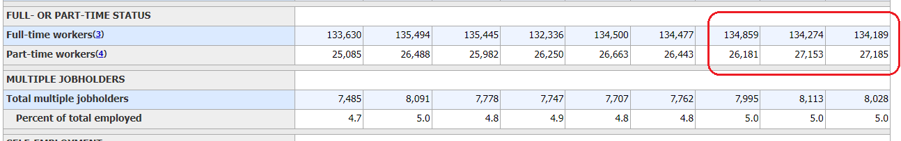 Если без сезонных поправок, исходя из таблицы, то за год с августа 2022 г. число рабочих мест с полной занятостью увеличилось с 133,630 до 135,445 = на 1,815 млн. рабочих мест (+1.01%).