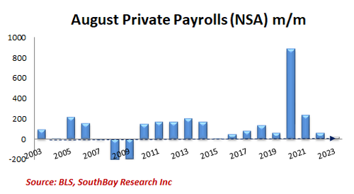 Кроме того, аналитики ZH уличили Минтруда США в том, что они продолжают использовать в статистике "сезонные поправки", запущенные в ковидлу, несмотря на то, что ситуация изменилась и используемые поправки стали неприменимы. А если посмотреть на данные без поправок, то август-2023, с точки зрения динамики рабочих мест в частном секторе, стал худшим с августа 2009, т.е. с разгара первой волны суперкризиса: