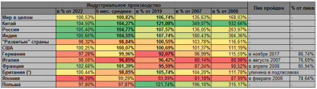 14. Текущий уровень индустриального производства по сравнению с 2000, 2007, 2019 и 2022 годом (первый и второй столбец отличаются тем, что в первом делается сравнение только последнего месяца с тем же месяцем год назад, а второй столбец берет 6-ти месячное среднее), а также когда был пройден пик производства, в тех странах, где он был пройден:
