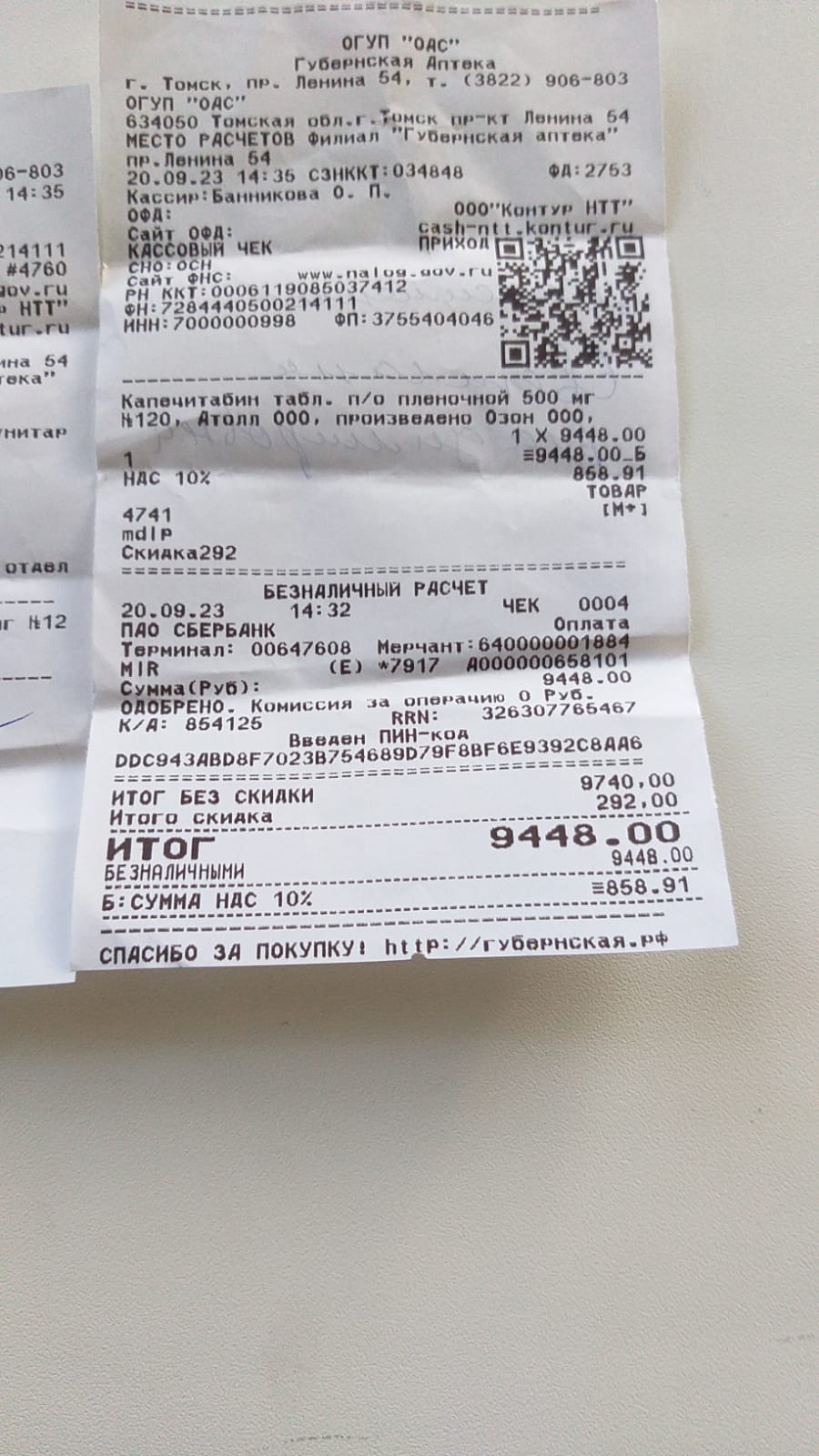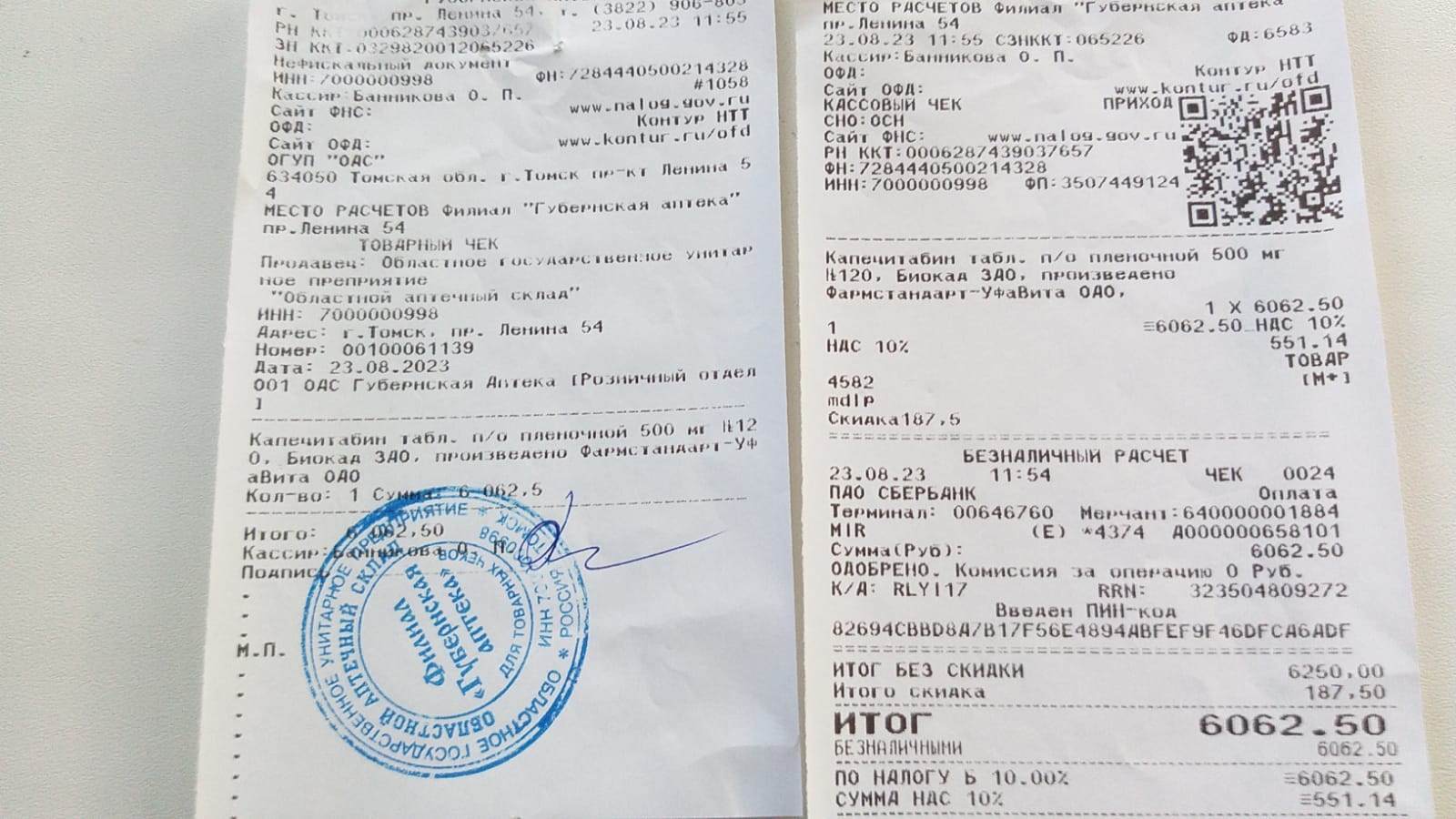 Чек на сумму 6 062 р за упаковку Капицетабина от 23.08.23