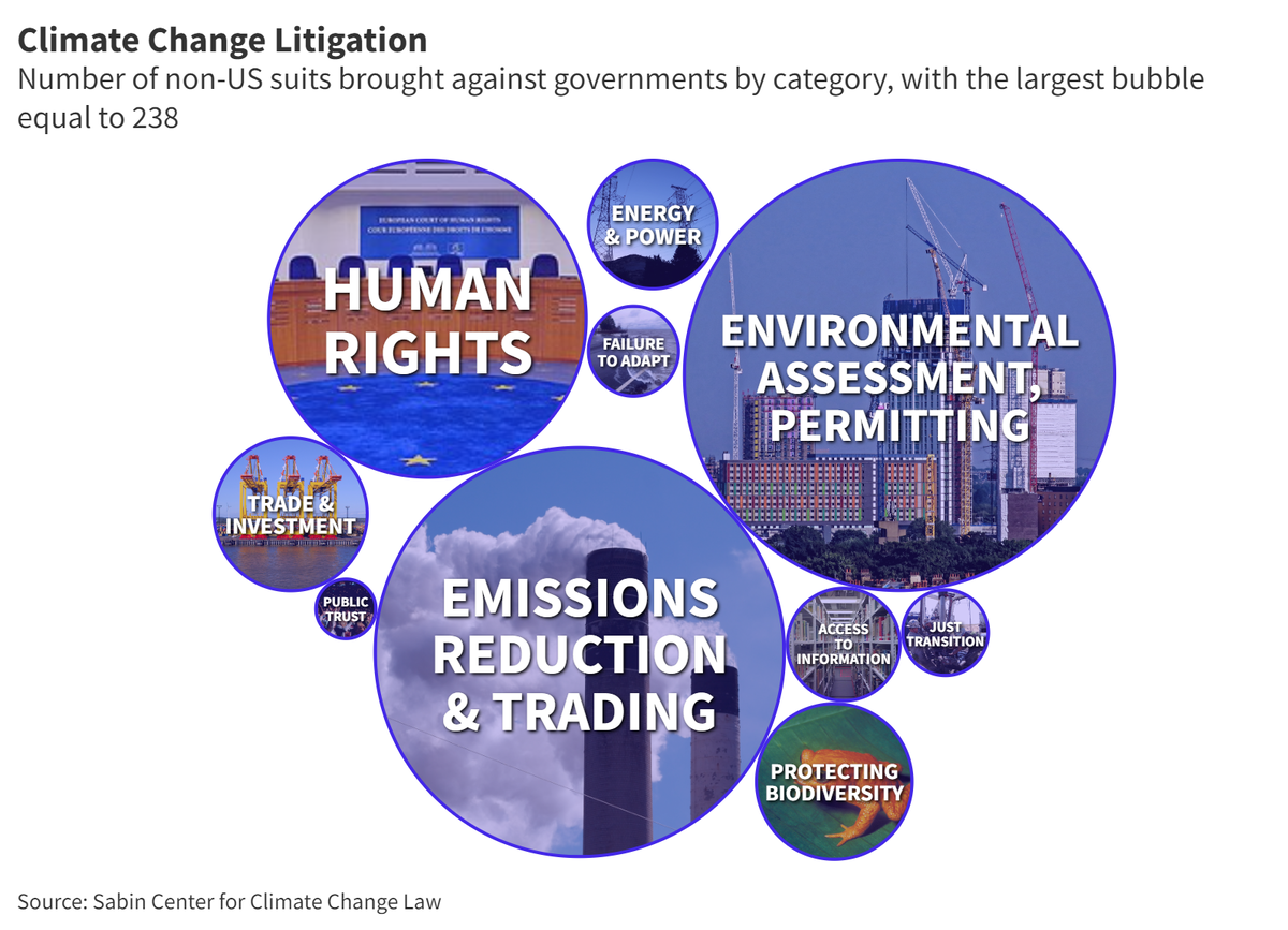 Согласно базе данных Global Climate Change Litigation, во всем мире было зарегистрировано более 130 дел, в которых к правительствам были предъявлены иски, основанные на нарушениях прав человека.