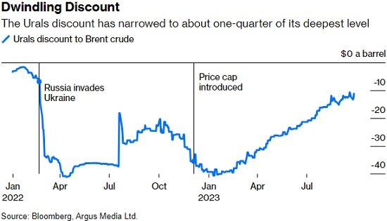 Дисконт продолжал увеличиваться и после вступления в силу ограничения цены, но он никогда не превышал уровня, достигнутого в первые месяцы после начала действий России на Украине* и вскоре снова начал сужаться.