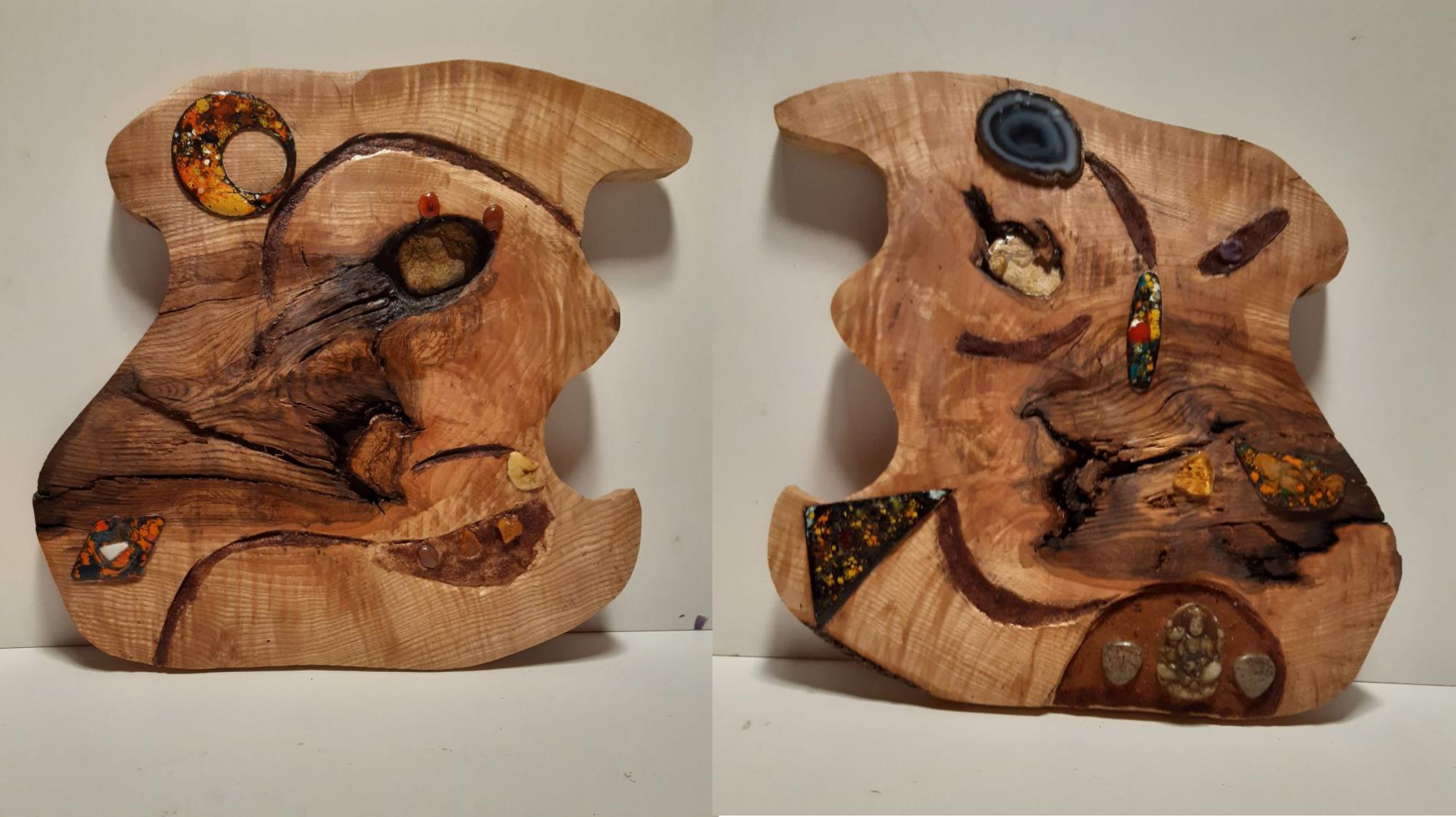 Новость для некоторых. Увидев этот срез дуба, сразу, отметила углем форму и попросила мужа вырезать. Абсолютно не свойственно мне. Я работаю с красками, муж – скульптор по дереву.