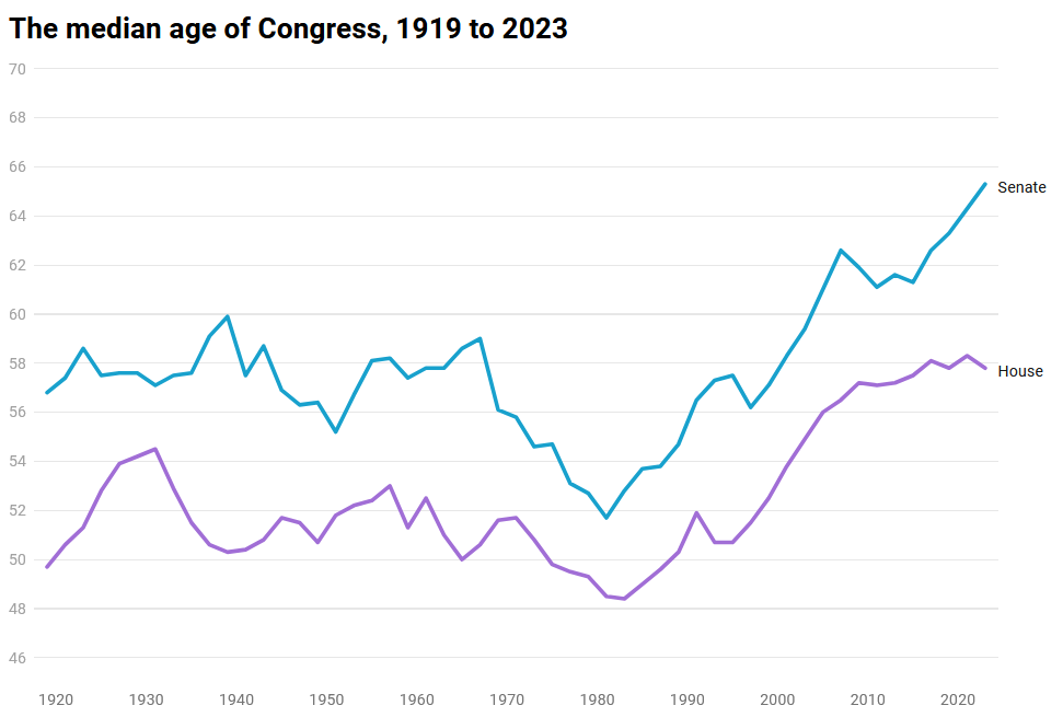По словам Стокемера, когда Конгресс собрался в январе 2023 года, средний возраст тех, кто служил в Палате представителей, составлял 58 лет. Средний возраст членов Сената составлял 65 лет.