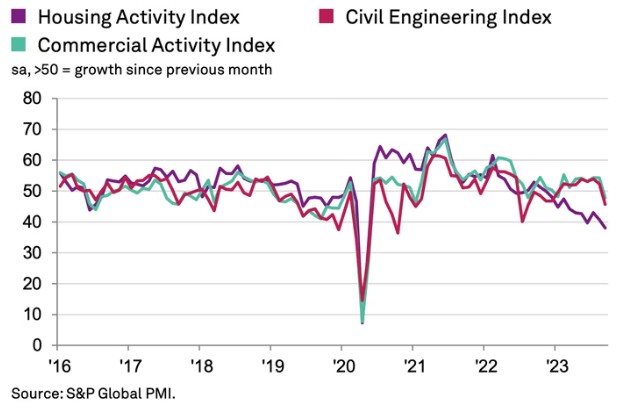 Быстрый спад активности в жилищном строительстве стал серьезным препятствием для рабочей нагрузки, при этом строительные компании широко комментировали сокращение проектов строительства новых жилых домов из-за вялого спроса и роста стоимости заимствований. Опасения по поводу перспектив внутренней экономики также снизили расходы клиентов в сентябре, что способствовало самому быстрому сокращению коммерческого строительства с января 2021 года.