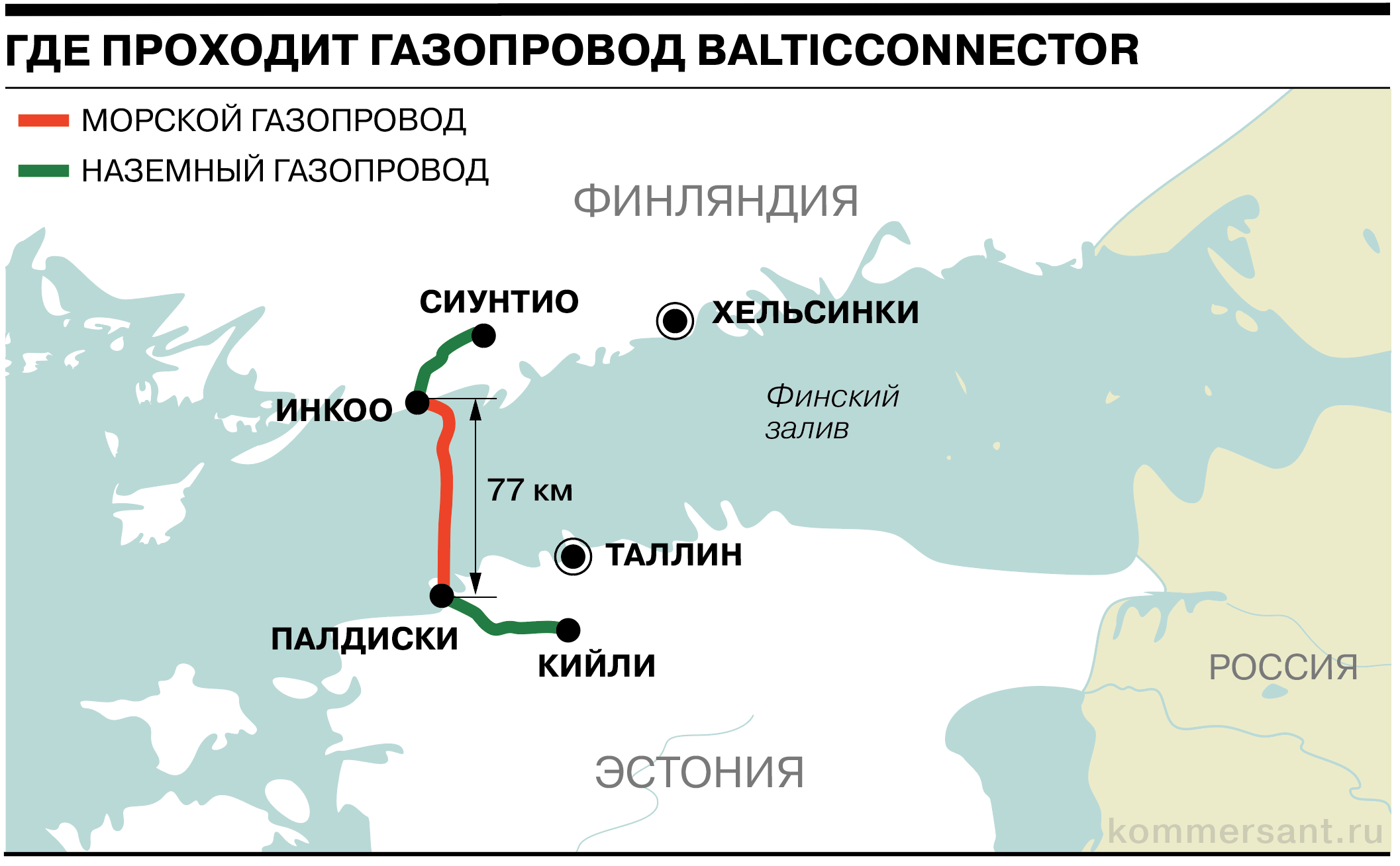 Газопровод состоит из 77-километрового двунаправленного морского трубопровода между городами Инкоо в Финляндии и Палдиски в Эстонии, 21-километрового наземного трубопровода в Финляндии и 55-километрового трубопровода в Эстонии. Измерительные и компрессорные станции расположены в эстонских Инкоо и Керсалу. Морская часть эксплуатируется совместно операторами Elering и Baltic Connector, в то время как наземные участки трубопровода эксплуатируются отдельно каждой из сторон. В среднем в сутки объем поставок газа по трубопроводу может доходить до 7,2 млн куб. м ... За первый месяц работы газопровод обеспечил более трети потребности Финляндии в газе — 885 ГВт•ч, а внутреннее потребление в Эстонии составило 565 ГВт•ч... К 2020 году операторы газовых сетей Эстонии, Латвии и Финляндии подписали договор о создании единого газового рынка, а в 2022-м — единой газовой зоны... Компании Elering и Gasgrid заявили, что не ожидают нехватки газа, даже если трубопровод останется неработоспособным зимой.