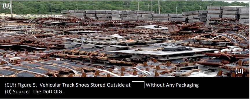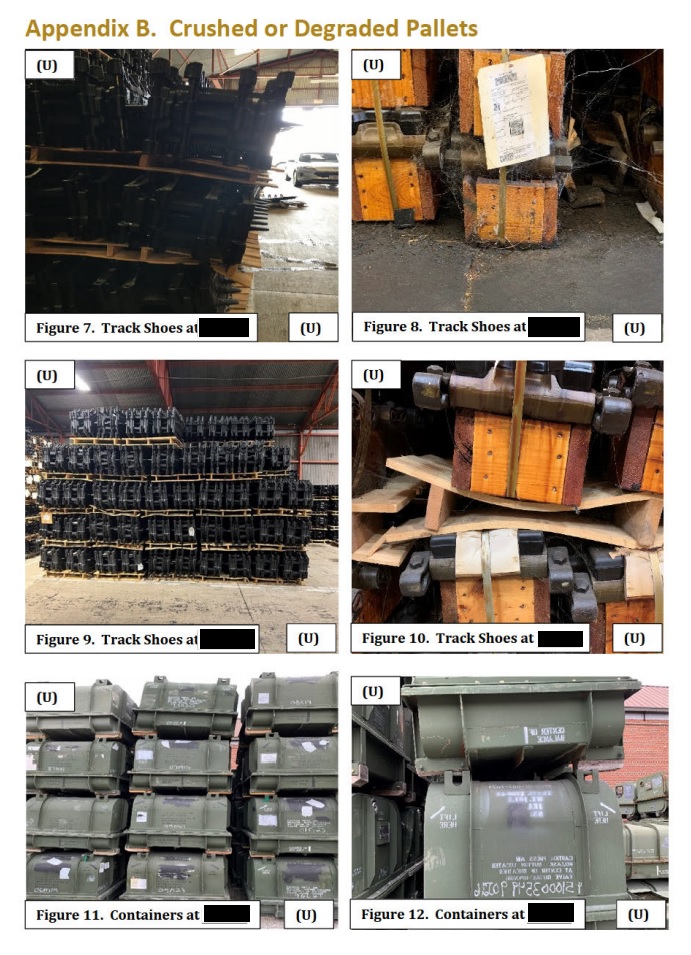 Следователи также обнаружили гусеницы танков, агрегаты трансмиссии транспортных средств и дизельные двигатели стоимостью в десятки миллионов долларов, расположенные под открытым небом без надлежащей упаковки.