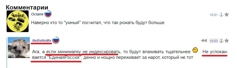 Если же загнанный в угол фактами аналитик НеБеНеМе начнёт выкручиваться и заявлять, что он не он и корова не его и вообще он имел ввиду решение о пропуске индексаций не минималки (но в комментах говорит именно про неё!), а окладов чиновников, судей, помощников сенаторов и полицейских с военными, то предлагаю поместить его в колбу со спиртом и в Кунсткамеру. Как первого в истории РФ оппозиционера, который сокрушается о временном НЕповышении окладов тех категорий граждан ("чинуши и погоны"), от повышения оплаты которых оппозиция десятилетиями ... негодовала.