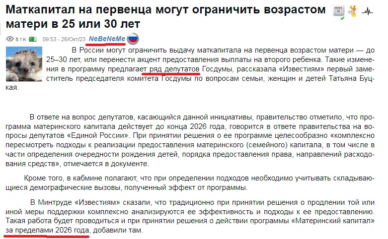 1) Достаточно просто внимательно прочесть исходную статью "Известий", а не коммент к ней автора репоста, чтоб понять, что ни о какой отмене выплат маткапитала роженицам какого-либо возраста сейчас и речи не идёт. Маткапитал действует до 2026 года! Сейчас 2023, алё гараж. То есть ближайшие три года вообще ничего и ни у кого не "отнимают". Ни в какой трактовке.