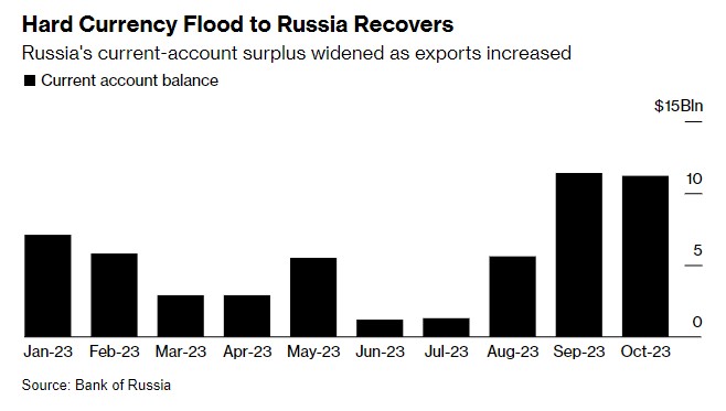 Свежие данные показывают, что Россия продолжает получать выгоду от высоких доходов от экспорта сырьевых товаров. Мы ожидаем, что в оставшиеся два месяца 2023 года Россия продемонстрирует рост профицита текущего счета еще на 20 миллиардов долларов, в результате чего общий внешний баланс составит около 75 миллиардов долларов. Растущие доходы от экспорта помогли остановить падение рубля, но в ближайшие месяцы российская валюта может подвергнуться испытанию, поскольку правительство восстанавливает свои валютные резервы.