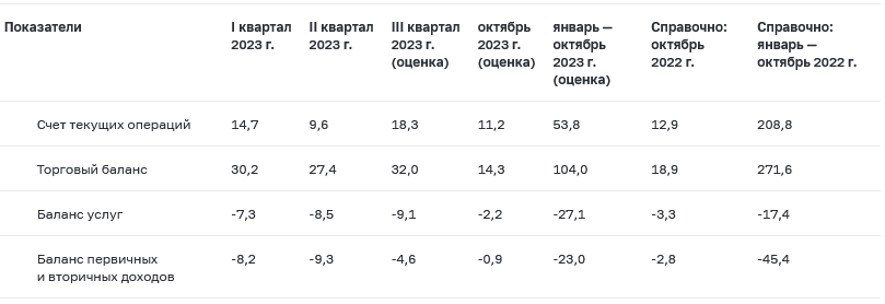 В январе — октябре 2023 года профицит счета текущих операций составил 53,8 млрд долларов США (208,8 млрд долларов США в соответствующем периоде 2022 года).