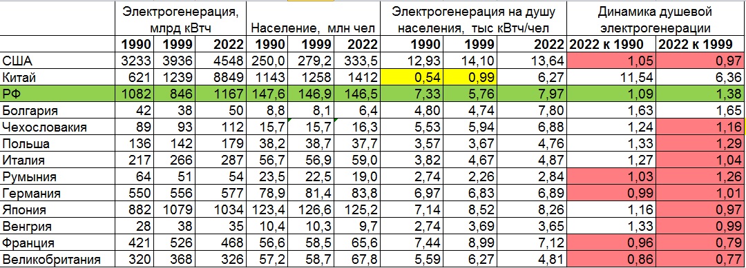 Специально ввёл в таблицу 1999 год. Чтоб показать степень "обоснованности" тыканья динамикой Китая именно гражданам сегодняшней путинской РФ. При сравнении динамик к последнему ДОпутинскому году (1999-му) Россия вообще опережает 10 из 12 стран. Уступая только собственно Китаю и маленькой экзотике - Болгарии (но там свои причины, сильно снизившееся население, экспорт ээ за рубеж...).