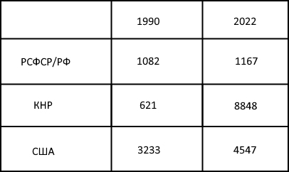 PS Если уж на то пошло. К 1999 году в Китае ПОЛВЕКА правила Компартия. Но до 1999 они, как видим, умудрились проколупаться на уровне технологического развития который в контексте конца 20 века просто стыдно комментировать. А с начала 21 века, когда элементы капитализма и рынка стали там уже просто колоссальной частью хозяйственной жизни страны - см. таблицу. "Результат на табло". Я понимаю, что эта реальность крайне болезненна для многих. Но это реальность. Обсуждайте её. Обсуждайте Россию, которая умудрилась компенсировать всё проседание 1990-ых и к 2020-м догнать тех кто её в 1991 выиграл. Если честно, я знал, что догоняем, но не думал, что догнали.