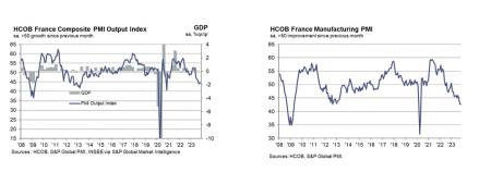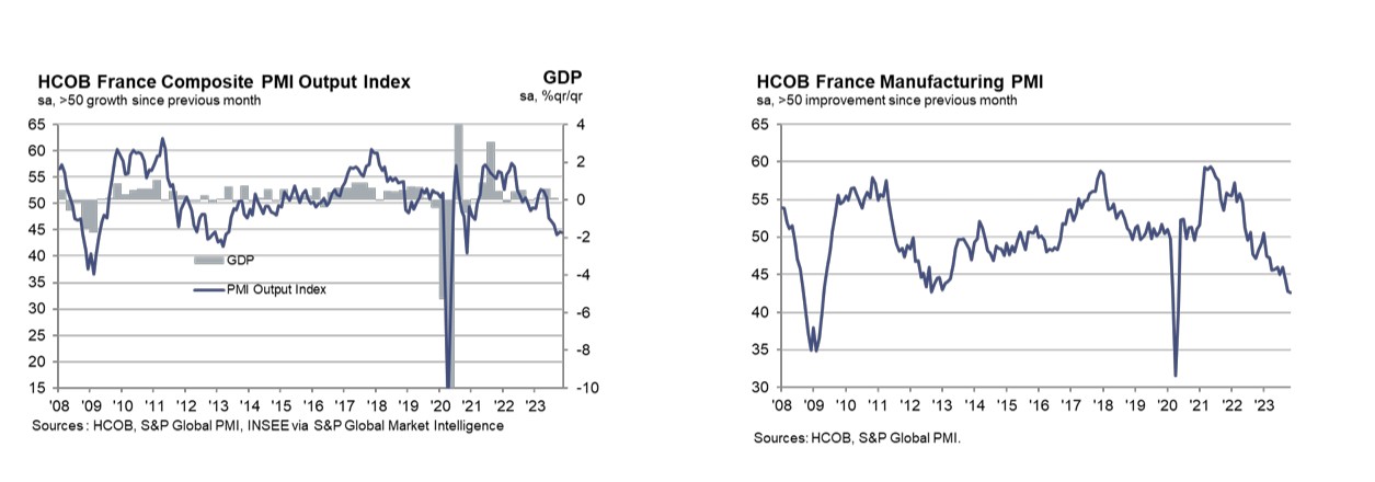 «Французская экономика находится в своего рода тупике. Производство снижается шестой месяц подряд, особенно из-за снижения спроса в целом и за рубежом. Уровень активности обоих секторов – производства и услуг – значительно снизился в ноябре. Похоже, главную роль здесь сыграла геополитическая и экономическая неопределенность, которую некоторые компании называли причиной отсутствия новых заказов. Наша прогнозная модель, включающая последние данные PMI, указывает на незначительное снижение темпов роста ВВП. «Компании сферы услуг изо всех сил пытаются выбраться из грязи. Снижение уровня активности, ужесточение условий финансирования и снижение спроса снижают оптимизм компаний. Хотя соответствующий PMI оставался выше 50, он значительно ниже долгосрочного среднего значения. Однако сервисные компании смогли предложить своим клиентам более высокие цены . «Безработица, вероятно, вырастет в ближайшие месяцы. Занятость упала впервые с конца 2020 года после явной тенденции к снижению в последние месяцы. Производители увольняют работников, в то время как компании сферы услуг нанимают их медленнее. Тенденция к снижению индексов PMI была подтверждена официальными данными по занятости INSEE, которые показывают, что уровень безработицы вырос за последние два квартала. «Угроза инфляции остается значительной. Последние данные PMI указывают на то, что цены по-прежнему резко растут, предполагая, что официальная статистика инфляции может оставаться на более высоком, чем ожидалось, уровне дольше, чем предполагалось ранее. Цены на производственные ресурсы снова выросли практически такими же быстрыми темпами, как и в прошлом месяце, в то время как цены на продукцию снова пошли вверх. Движущей силой роста индекса цен на продукцию стали компании сферы услуг. В целом, давление цен на ресурсы остается сильным, и, учитывая динамику воздействия инфляции цен на ресурсы на потребителей, это означает, что восходящая траектория цен на продукцию, возможно, еще не завершилась».
