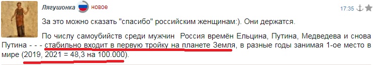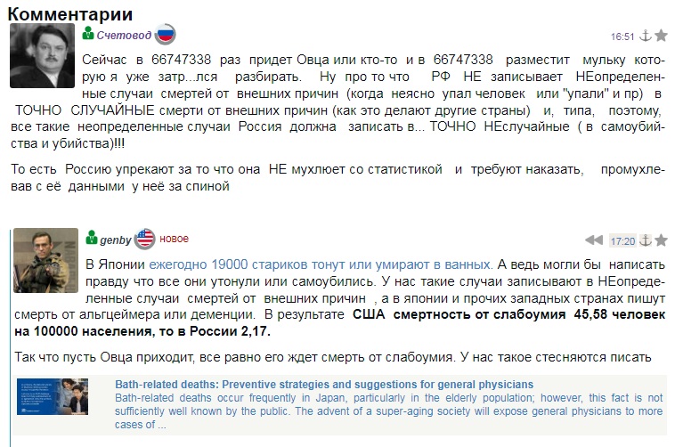 Сегодня, под статьёй Genby, о том, что Россия и потому Россия и близко не в лидерах по самоубийствам, я уже заранее знал, что эту лживую мерзость опять притащат в комменты. Как это делают уже годами! Да и Genby тоже сталкивался, похоже: