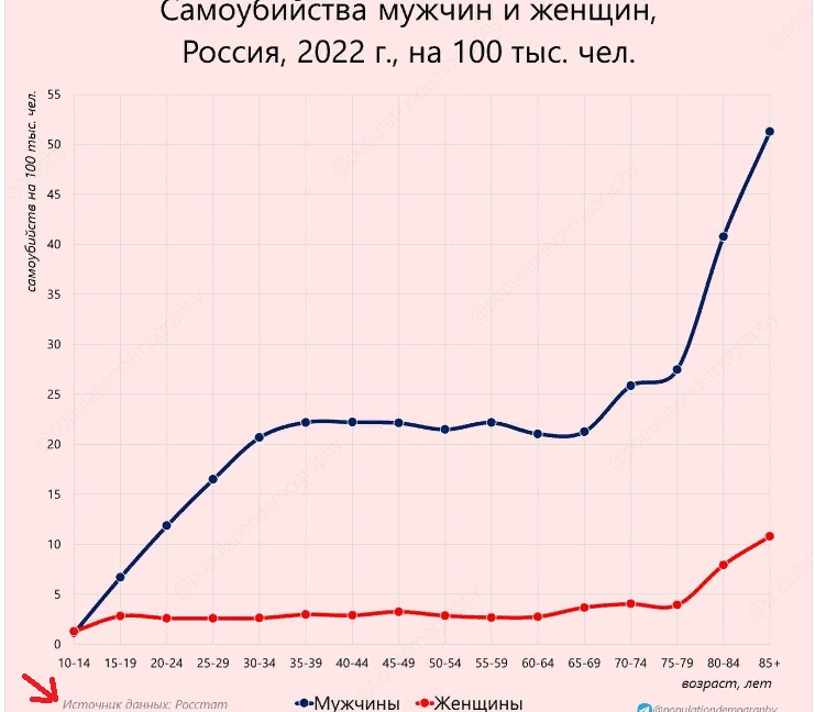 Смертность от самоубийств у мальчиков младше 10 вообще не показана (это и понятно - она нулевая). Далее мы видим в возрастах до 30 лет (у мужчин) смертность менее 20 на 100 тысяч. Более того - в возрастах на которые приходится тотальное, подавляющее большинство мужчин (от младенцев до 79-летних стариков) смертность от самоубийств составляет от нуля до 20 с чем-то. Единственная возрастная категория мужчин на графике, у которых смертность превышает 48 - это старики 80 лет и более. Доля которых в популяции мужчин просто ничтожна. И даже у них лишь в районе 51-51 судя по картинке.
