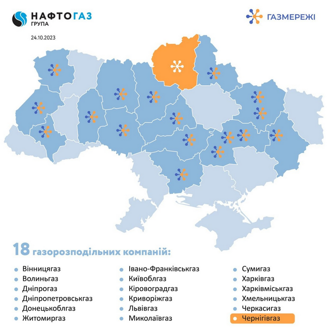 26 октября Черниговские газораспределительные сети стали 18 предприятием, которое вошло в группу «Нафтогаз». Предприятие обеспечивает доставку газа для почти 360 000 домов,а также для бюджетных и религиозных организаций, промышленных объектов, а также двенадцати коммунальных предприятий региона.