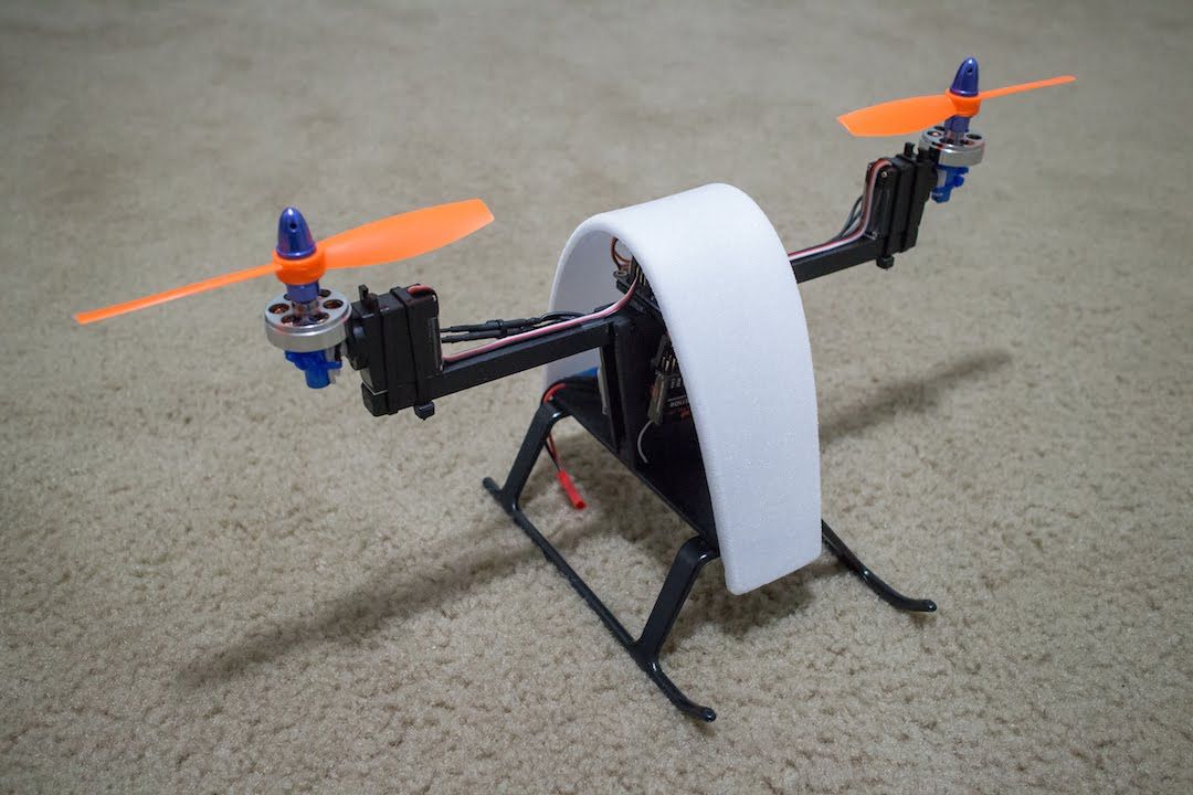 Идея системы очень простая – моторы стоят на общей поперечине, но не неподвижно, а на рулевых машинках – которые могут их наклонять взад и вперед. Такая схема потенциально более экономична, чем квадрокоптер, и способна развивать более высокую скорость – но главное, что она хорошо сочетается с несущим крылом.