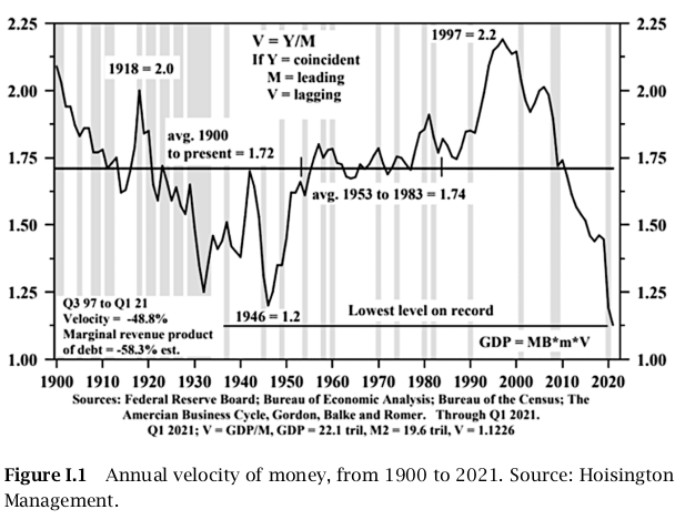Рисунок I.1 Годовая скорость оборота денег, с 1900 по 2021 год. Источник: Hoisington