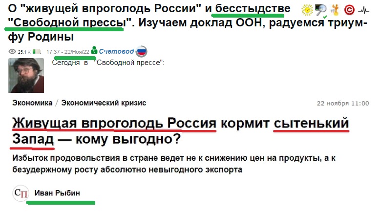 И вновь я с грудой фактов и ссылкой на первоисточник (Доклад ООН о продовольственной безопасности в мире) доказал, не высказал мнение, а именно доказал, что ублюдок Рыбин при пересказе Доклада извратил его содержание чуть не до полной противоположности. В реальном Докладе ООН показано (причём просто цифрами), что в России одна из наименьших в мире долей населения имеющего проблемы с доступностью еды. Ублюдок Рыбин, не приводит из Доклада примерно никаких цифр, а ту цифру, что всё же привёл не сопоставил с данными по другим странам. По "логике" ублюдка Рыбина, 0,4 миллиона человек имеющих трудности с покупкой еды (в плане просто кол-ва) на 146-миллионную страну (то есть сильно меньше одного процента!) - это "Россия живёт впроголодь". О том, что согласно такой мерке большинство остальных стран мира Рыбин должен был бы назвать "уже вымершими от голода"- Рыбин умолчал.