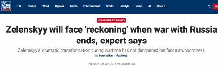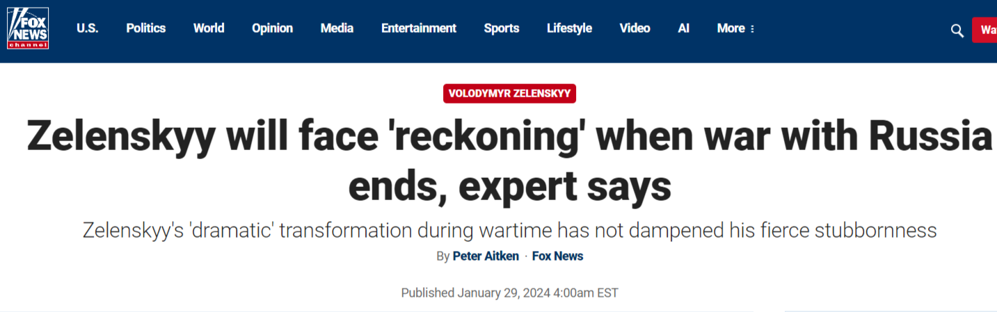 29 января FOX News: Президента Украины Владимира Зеленского ждет расплата, когда закончится конфликт с Россией. Либо со стороны победившей Москвы, либо со стороны общественности, требующей ответов после беспорядочного хоть и одухотворенного сопротивления Украины.