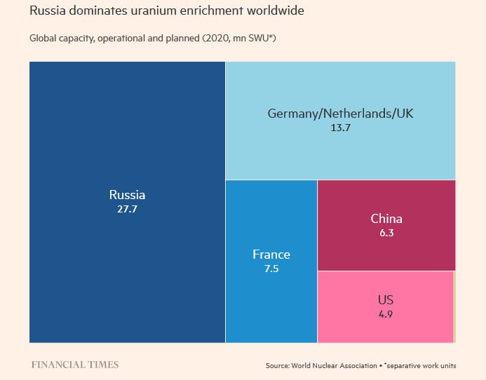 Цепочки поставок обогащенного урана также небезпроблемны. Почти половина мировых коммерческих мощностей по обогащению урана находится в России.