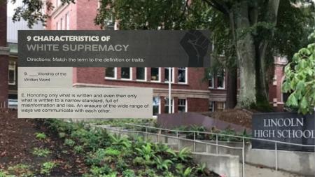 В рабочем листе, который раздали учащимся средней школы Линкольна, был задан вопрос: «Как характеристики превосходства белой расы проявляются в нашей личной жизни и отношениях?».