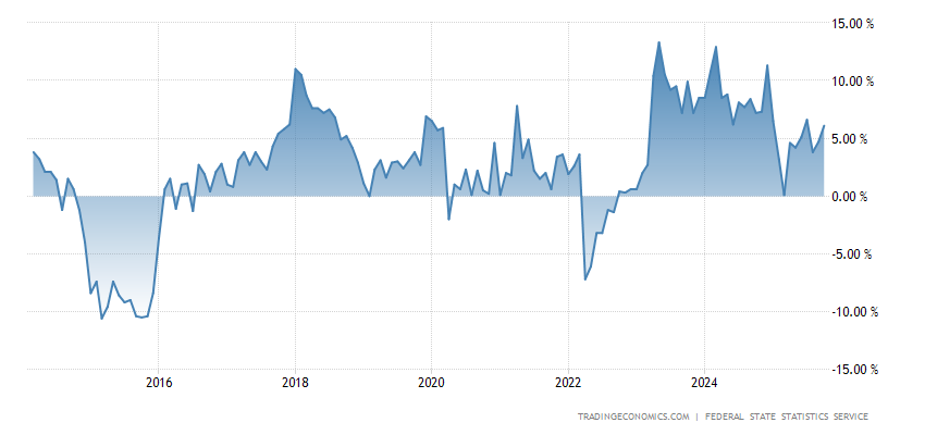 В России рост реальных заработных плат измеряется по сравнению с предыдущим годом изменением среднемесячной ЗП, учтенной инфляцией.