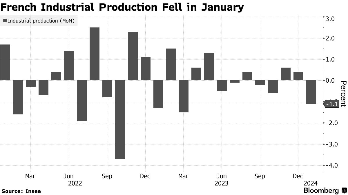 Объем производства в январе упал на 1,1% по сравнению с предыдущим месяцем, в то время как экономисты, опрошенные Bloomberg, ожидали сокращения только на 0,1%. Статистическое агентство Insee также пересмотрело декабрьский показатель в сторону понижения до 0,4% роста с 1,1% ранее.