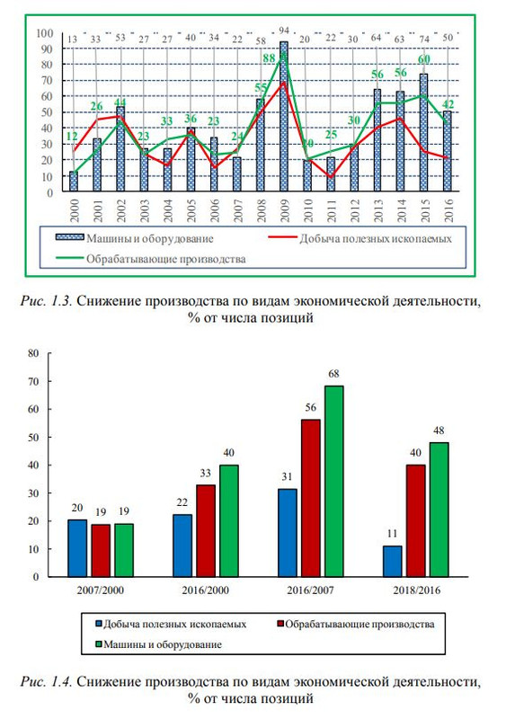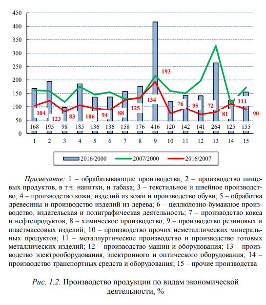 Мера отмеченного снижения отнюдь не символична. Если в 2016 г. по отношению к 2000 г. производство сокращалось, то в среднем вдвое. Правда, и средние темпы роста по увеличивающимся позициям выглядели впечатляюще: они составили в 2016 г. по отношению к 2000 г. 171% по обрабатывающим производствам, 75% – по добывающим, почти 200% – по машинам и оборудованию.