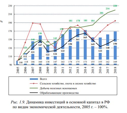 И да, и нет. Действительно, темпы роста инвестиций в добывающие производства всегда оказывались выше, чем в обрабатывающие. Но! До 2008 г. темпы роста инвестиций в добывающие и обрабатывающие производства были сопоставимы. С 2009 г. обрабатывающие производства начали отставать, а с 2015 г. инвестиционные траектории добывающих и обрабатывающих производств разошлись: инвестиции в добывающие производства продолжали расти, а в обрабатывающие производства начали резко (по 10 п.п. в год) снижаться. Инвестиции в сельское хозяйство осуществлялись хорошим, хотя и рваным темпом. Лишь с 2014 г. они стали явно отставать от темпов роста инвестиций в добывающие производства (рис. 1.9).