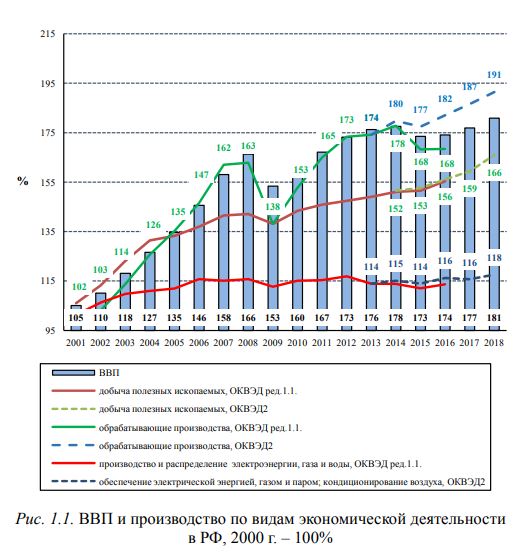 1.1. Производство промышленной продукции В 2001–2007 гг. среднегодовые темпы прироста ВВП составляли немыслимые по сегодняшним меркам 6,7%, добычи полезных ископаемых – 5,1%, обрабатывающих производств – 7,1%. В 2012–2018 гг. (оставим в стороне кризисные 2008–2009 гг. и посткризисное восстановление в 2010–2011 гг.) рассматриваемые показатели оказались совсем иными: 1,14%, 1,85%, 2,15% соответственно. Таким образом, темпы экономического развития страны в последние шесть лет резко, если не сказать катастрофически, снизились. С учетом кризисных 2008–2009 гг. и лишь компенсаторного роста в 2010–2011 гг. экономика находится в депрессии уже десять лет и лишь 2017–2018 гг. демонстрируют слабую тенденцию к выходу из этого состояния.