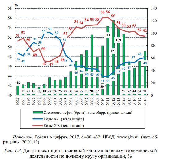 Выше отмечался инвестиционный рывок российской экономики в начале 2000-х годов. Более тщательное рассмотрение качества этого роста в очередной раз подтверждает известную истину – видимая часть явления редко отражает его сущность. Действительно, для решения стратегических задач развития страны важен не только рост инвестиций, но и его качество. На рис 1.5 хорошо видно, что темпы роста инвестиций в отечественную экономику были весьма высоки до 2008 г. Но данные рис. 1.8 говорят о том, что если до 2001 г. этот рост обеспечивался преимущественно за счет инвестиций в материальное производство (разделы A–F), то с 2002 г. вплоть до 2011 г. – уже за счет услуг (разделы G–O). Невозможно не заметить и связь между характером инвестиционного роста и динамикой нефтяных цен: чем дороже нефть, тем относительно меньше инвестиций идет в материальное производство и, соответственно, больше в услуги, и наоборот