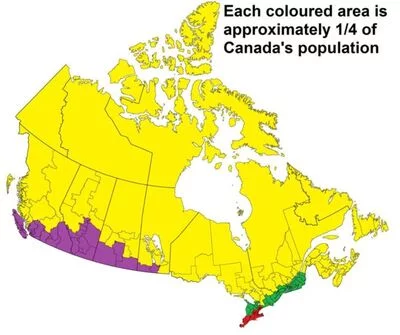 Врут что на картинке территория Канады, разделенная на 4 части с равным населением. Красное и зеленой 50%