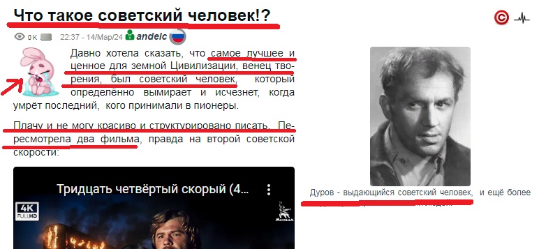 Распад мозга у этих сектантов. Пошло-пафосный инфантилизм, дошедший уже до уровня потери простейших мыслительных способностей. Как на Украине конца 2010-ых. Когда многомиллионная нация перепутала актёра с вымышленным популистским персонажем которого он сыграл (в "Слуге народа"). Но КАК, ТБМ?! Записать реального, убежденного антисоветчика (в отличие от счетоводов, мамомотов и genby, которые не против самого СССР, а против сладко-приторных сказок о нём) Дурова в "выдающиеся советские люди" на основании ....ролей в худфильмах! Это то что даже не хочется разоблачать. Хочется только обхватить голову руками от "испанского стыда", наблюдая это.