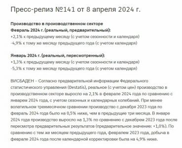 Реальность такова - промышленность в Германии падает уже 7 год (пик пройден в 2017). Бывают краткосрочные флуктуации от месяца к месяцу, которые мусолят журналисты но в долгосроке картинка такова: