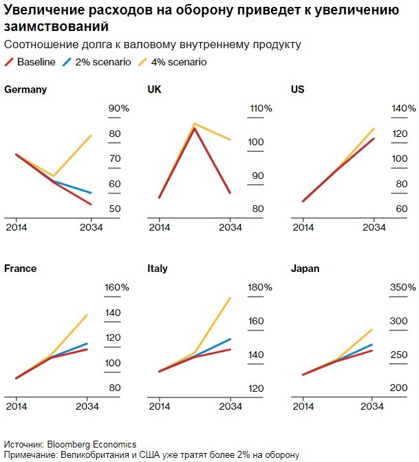 Даже США, которые уже выделяют на оборону 3,3 % своего годового ВВП, будут увеличивать заимствования с 99до 131 % в течение следующего десятилетия, если они доведут свой военный бюджет до 4 % ВВП.