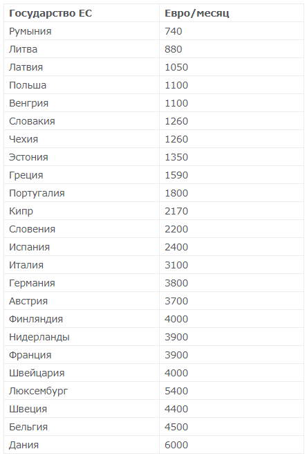 Между тем, месячная зарплата среднего европейца составляет 2,5 тысяч евро. Данная цифра, конечно, типа средней температуры по больнице и родилась из этой таблицы.