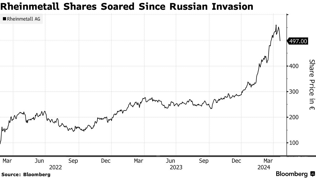 Rheinmetall , крупнейший производитель оружия в Германии, ожидает, что объем продаж превысит 10 миллиардов евро в этом году по сравнению с 7,2 миллиарда евро в 2023 году. Компания планирует увеличить годовое производство артиллерийских снарядов до 700 000 снарядов к 2025 году, что в десять раз больше, чем до российского вторжения. и с начала 2022 года наняла около 4000 человек по всему миру. Количество заявок только продолжает расти.