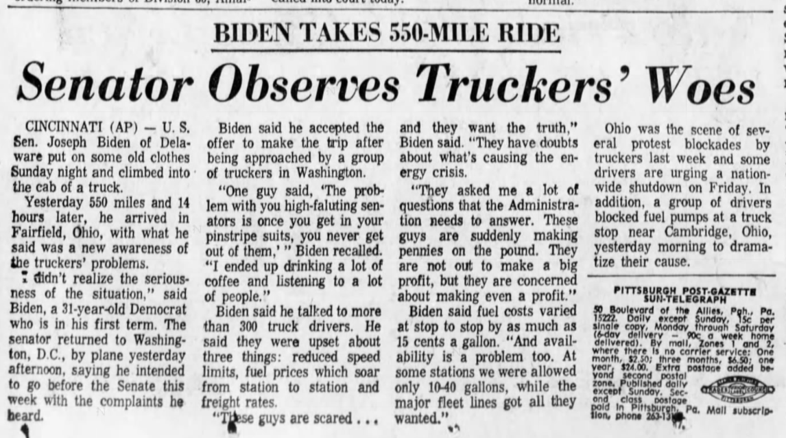 «Опыт Байдена в этой сфере заключается в том, что он ездил в грузовике один раз, одну ночь в 1973 году (правда, домой он вернулся на самолете)», — добавил он, поделившись газетной вырезкой о поездке Байдена в грузовике.
