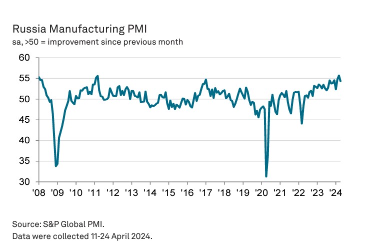 Согласно последним данным PMI® от S&P Global, российские производители сообщили о дальнейшем существенном улучшении условий своей деятельности в апреле. Хотя темпы роста производства и новых заказов немного снизились по сравнению с мартом, они оставались стабильными.
